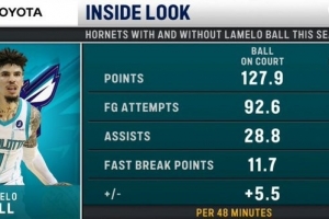 黄蜂自媒体晒出数据,当拉梅洛出站时,黄蜂每48分钟净负8.5分,当他缺阵时,48分钟净胜5.5分。