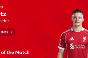 此役维尔茨踢满全场,并造穆基勒乌龙,为利物浦扳平比分,英超官方宣布,经过球迷的投票,维尔茨当选本场比赛最佳球员。
