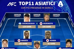 意甲出场最多的亚洲球员11人阵:中田英寿、长友佑都、奥代罗在列