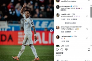 这也是罗德里戈自今年1月首次在西甲破门,赛后他也在个人社媒晒出本场照片,配文写道:“荣耀归于上帝!”
