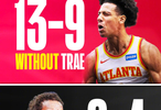 老鹰这个赛季至今15胜14负。没有特雷-杨的时候是13胜9负,特雷-杨打的6场则是2胜4负。虽然不能说没有特雷-杨好像就有多强似的,但是比赛证明了,老鹰没有特雷-杨其实也差不到哪去。